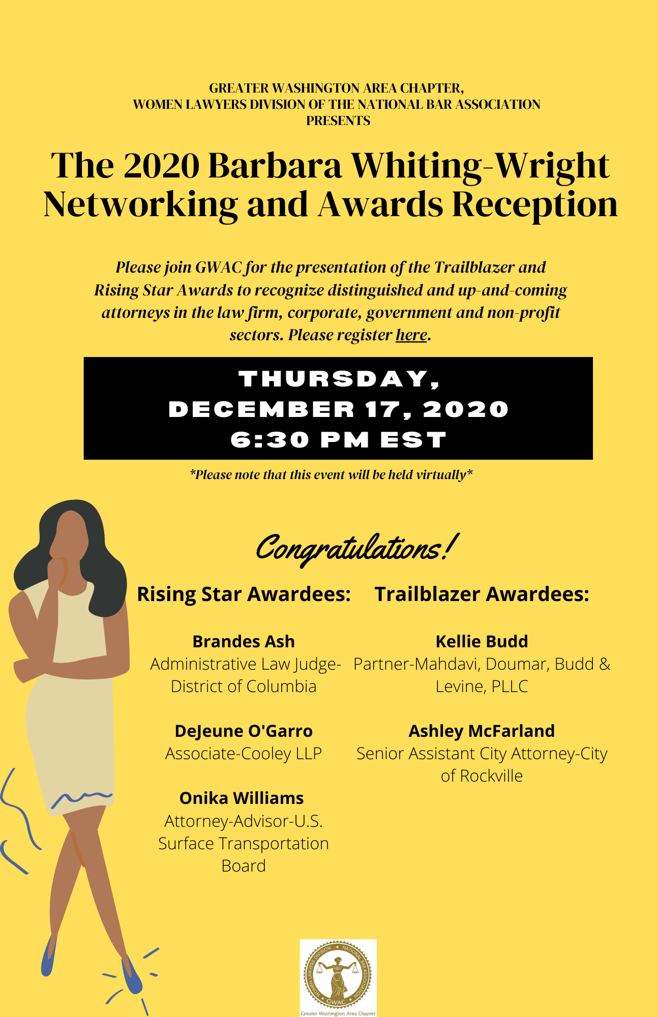 Kellie Budd was awarded the Trailblazer Award from the Greater Washington Area Chapter, Women Lawyers Division of the National Bar Association. The Award was presented at the 2020 Barbara Whiting-Wright Networking and Awards Reception. The reception recognized distinguished attorneys in the law firm, corporate, government and non-profit sector.